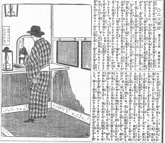 | 説明 | 記者が不審人物を追って探索中、大阪・高麗橋の電信分局に立ち寄って、社へ報告の電報を依頼している。和服に帽子という姿はめずらしくないが、この新聞記者はまるで女物の借り着でもしているようにだらしなく見える。これは男のきものとしては袂が大きく目立つためか、脇でゆるく結んだ兵児帯のぞんざいなためか、絣風だがどてら柄のように大きい縞柄のせいか、よくわからない。帽子に、そのうえ靴を履いていることが、どてらか寝間着でも着ているような不調和を感じさせるのだろうか。(大丸 弘) |