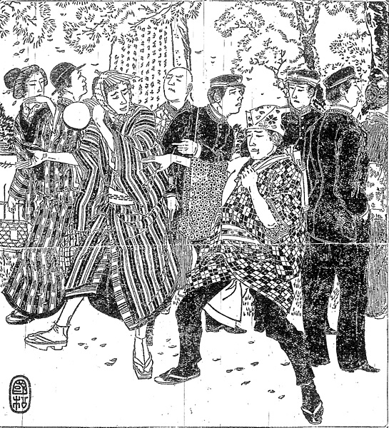 | キーワード | 花見;道中被り;道中かぶり;頬被り;頬かぶり;慶応義塾の学生;制服;中山帽;のめり下駄;ぞうり |