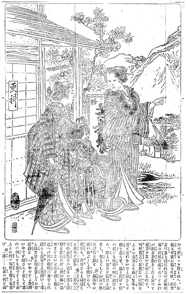 | 説明 | 信濃国は姨捨山にほど近い山村の郷士の娘、父にも母にも先立たれて十五になる姉と九つの妹とが二人だけの暮らしをしている。その暮らしをどう立てているのかの具体的な説明はないが、第2回の座敷の、ふたりの背後の障子をみれば貧しい不自由な生活であるらしい。「絹布を纏い居るものの、八丈やら銘仙やら見え分ぬほどべとべとに汚れたる綿入を着て、亀綾の羽織を重ね、縮緬の帯のくたくたなるを纏いつつ」というのが姉。「鬼の反吐ほどに汚れてはいるものの、元はさぞかし華やかにありつらん反古染の友禅に、なにやら絹の羽織を着せて、緋博多の帯を締めさせている」のが妹。第3回,第4回は両親の墓参りの途中で、草履をはいて蝙蝠傘を手にしているだけで着ているものはすこしも変わっていないから、あるいはこれが着たきり雀か。数え十五の娘には着ているものの洗い濯ぎはむりなのだろうし、絹ものの綿入れや袷のきものの手入れは滅多にするものでもないから、べとべとに汚れたる綿入、というのもこの時代、そうめずらしくはなかった。もっとも、丹念に模様の描き込まれた挿絵では、いずれも若い娘の着る華やかな衣裳のようにしか見えないが。姉の髪は鹿の子を掛けた結綿風、妹は稚児髷の変形のようだがよく分からない。(大丸 弘) |
