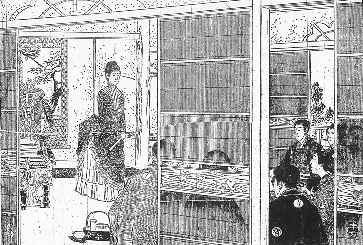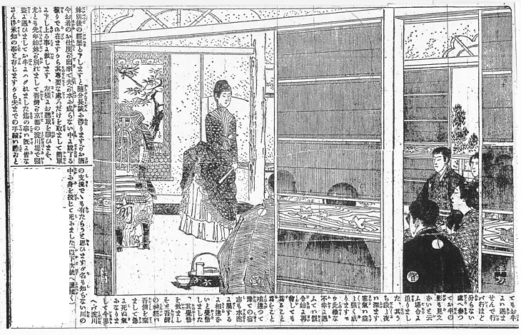 | 説明 | 長いこと行方の知れなかった妹が、立派な教育を受けて成人し、姉の前に現れる。第40回では四年前に淀川堤で姉と別れ別れになって以来の顛末を、芝公園の紅葉館に宴席を設け、縁のある人々を集めて「演説風に」物語る。不自然に大仰だし、それに西洋風の風俗を身につけたとはいえ、数え十三歳にしてはバッスルドレスが大人っぽ過ぎる。挿絵の水野年方はほぼリアルタイムの西洋の絵か写真を見て、そのまま描いたのだろうが、十二,三歳の少女の資料はなかったのだろう。また、第39回で妹が帽子を被ったまま姉たちの座敷に入ってくるが、日本座敷と女性の被りものの問題は後々まで課題として残る。それは個人宅だけでなく、だいたい和風の構造を持っていた紅葉館での女性の帽子は、鹿鳴館とちがって異様な印象を与えた。紅葉館は鹿鳴館ができるまでは東京一の宴会場で、この時代も公私に広く利用されていた。(大丸 弘) |