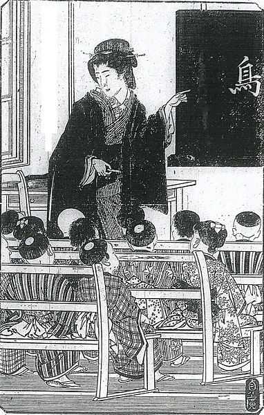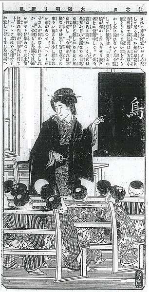 説明 登場人物二人の話の中の仮想場面。器量よしの芸者がなにを思ったか学校の教師になりたいと言い出した。口入屋の女将が呆れて、「学校の女教師などに是はと思う程の別嬪は少なく随分化粧(ツク)り立ててもやっと十人並み」とか「束髪とやら云う琉球人見る様な髪にて護謨靴を軋らせ色眼鏡など掛けた所は男か女か判らぬ程」などとくさしている。芸子島田の先生の前のベンチにおとなしく座っている子どもたちは、小学生にしても少し幼なすぎ、上等のきものでありすぎるが、だれもが髪を耳の辺りまで剃り上げて、中には丸坊主や、頂点を河童のように丸く剃った者もいる。もともと子どもは体熱が高いのでのぼせやすく、それを発散させるためと称して、江戸時代には芥子(ケシ)坊主とか、奴とか、唐子とかいうスタイルで、頭を剃ろうとする傾向があった。学制がはじまってからそんなことはなくなったが、明治初年にはいくぶんその遺風があったかもしれない。(大丸 弘)