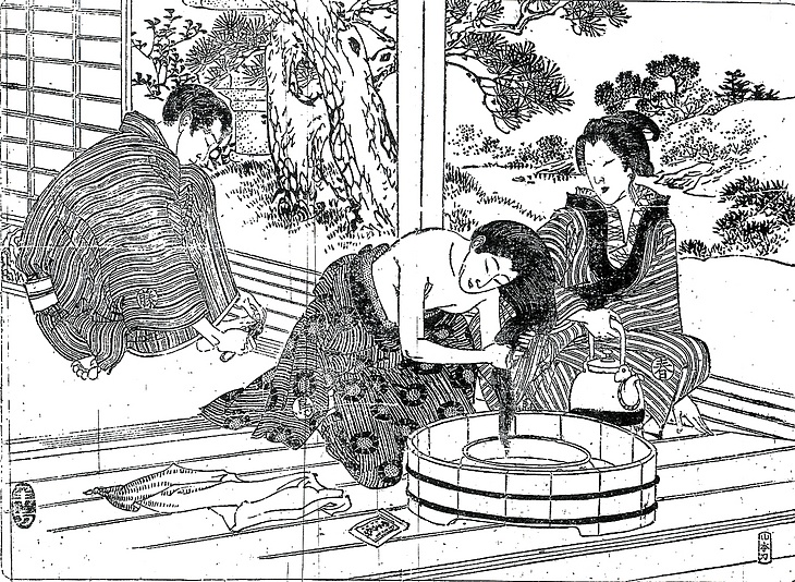 | 説明 | 裁判所から保釈が認められて出所すると、「直ぐさま旅宿へ引取りて沐浴(ユアミ)させ衣類を替えさせ(……)」とある筋書きに対応しているが、入浴と髪洗いはべつにしているらしい。日本人の入浴好きは有名だが、髪を洗うことは滅多にしなかった。その大きな理由は、油の染み込んだ、量の多い毛髪を洗うことが大変だったためだろう。この女性は上半身肌脱ぎをして、洗濯盥の中に金盥を置き、母親がかたわらですすぎの湯を薬缶から注いでやっている。この女性は市販の洗い粉を使用しているらしいが、しかしこれでは汚れがじゅうぶん取れるとは思えない。(大丸 弘) |