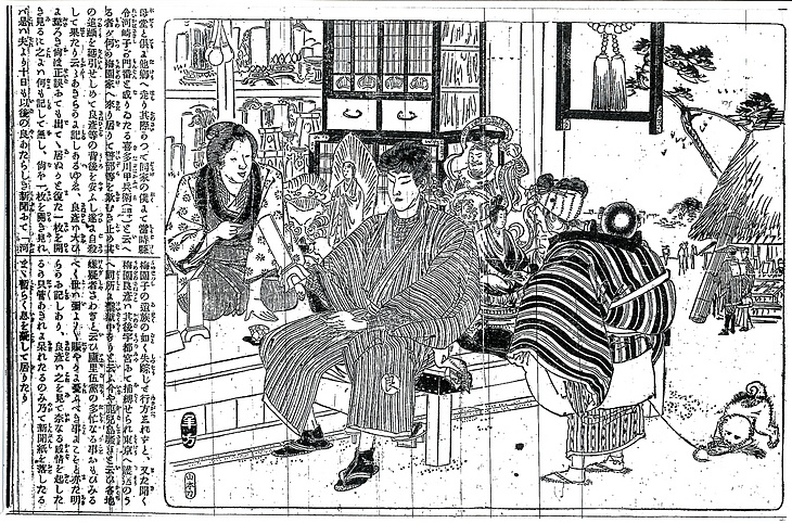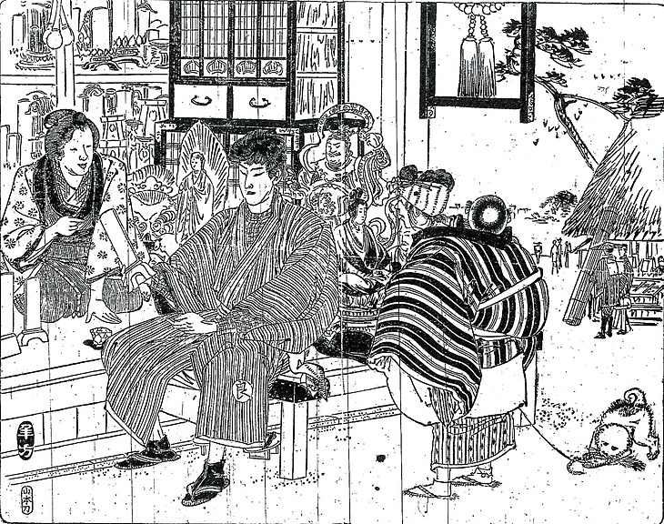 説明 家僕として雇われることになった主人公の青年が、さしあたりの小遣いとして主人から与えられた十円を手に「急ぎ市中に走りゆきて、白木の位牌と花立およびその他これに付属するものを買い集め」とある部分。主人の妻に「着物はこちらで世話をします、そのうち月給を極めましょう」と言われているので、いま着ている親子縞のきものは私物。下に丸首の細かい格子縞の長袖シャツを着て、紺足袋に草履ばき。学生を含めて若者のふつうの恰好だった。あまり「市中」のようには見えない景観だが、ともあれこの店は仏具商らしい。軒先にはそのしるしの、大きな数珠をアレンジした看板が下がっている。店先で商いの様子を見ている子守りっ子は、この時代、ローティーンか小学校高学年くらいの少女にとっての、だいじな内職でもあった。負ぶっている子に乱されないように、髪を子守りっ子かぶり結びで包み、小さな身体に余るねんねこ半纏を着せられている。(大丸 弘)