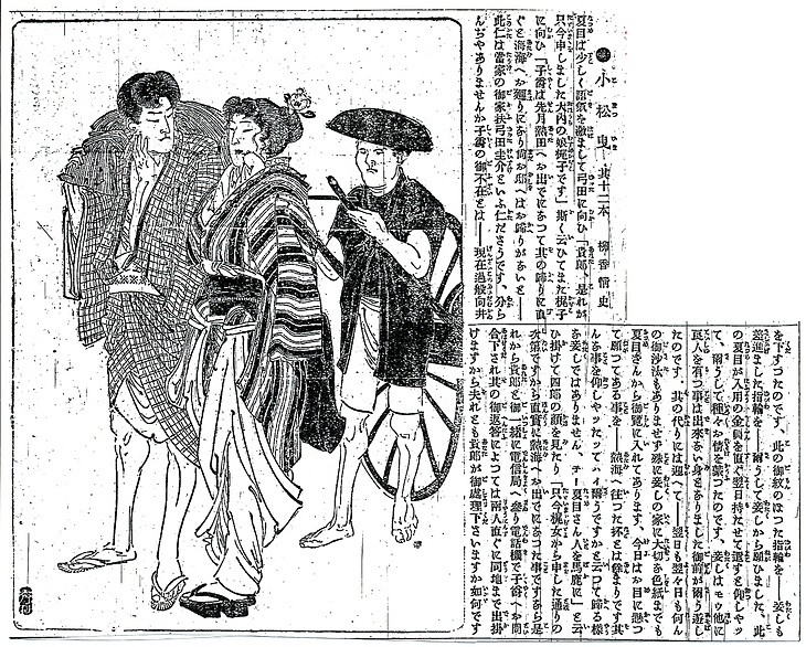 | 説明 | 男女とも一般的なはしょり方だが、やりようではけっこう荒っぽい勇み風になる。ふたりとも、懐に手をいれているなど、これからの行動を思案中。しかし、娘のポーズとしては勇み風と言わざるをえない。女性の髪型は、切前髪(キリマエガミ)のようで、西洋風束髪と組み合わさっている。(大丸 弘) |