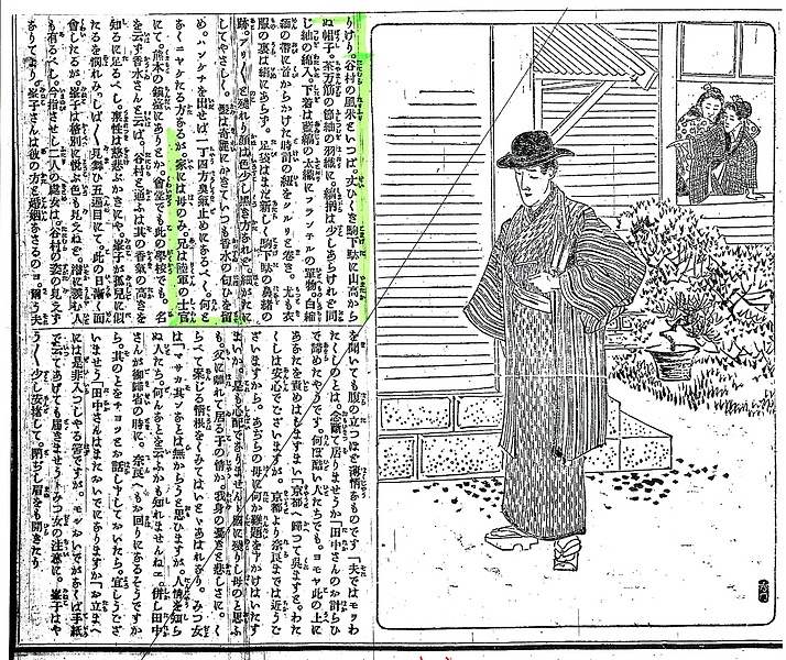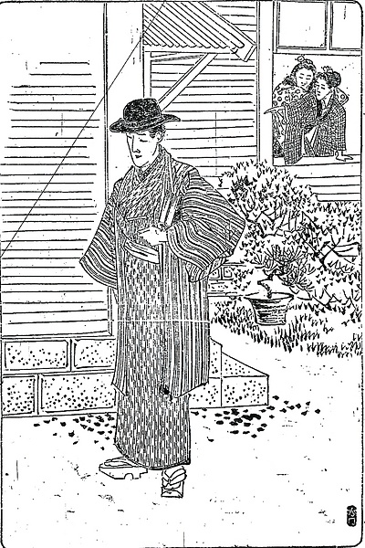 説明 女学校の校門に向かっているこの若い男については、男にはめずらしいほどの懇切な衣裳付けがある。その中に、首から掛けた時計の紐を、白縮緬の帯にクルリと巻き――とある。この時代はまだ腕時計が普及しないで、携帯には男女とも懐中時計を用いたが、和服の場合は懐に突っ込んでおくだけでは不安心なため、たいていは紐で首から吊り、その紐に金銀の鎖を使うことも多かった。ことに女性はこの鎖がいちばん目立つ装身具になって、当時の肖像写真を見るとよく目につくもの。(大丸 弘)