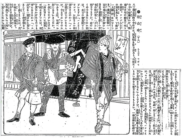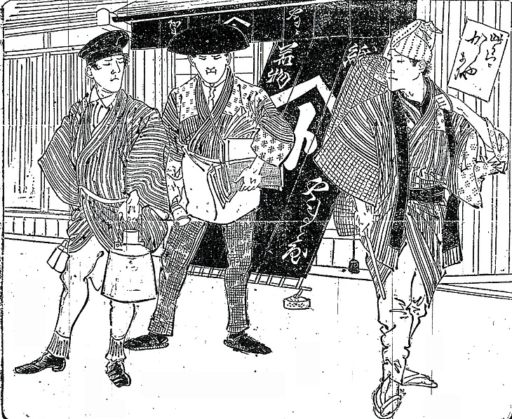 説明 左から、牛乳配り、新聞売り、紙屑買い、つまり屑屋。舞台の一場面のように見える。屑屋は江戸時代からおなじみの商売で芝居や落語にもよく登場する。半纏股引に縞のきものはどんな小商人にも共通する恰好だが、背中に鑑札を貼りつけた大きな目籠を背負い、手には天秤ばかり、手拭いを吉原被りにして、「屑ーイ、お払い」といって、主に裏店や露地のようなところを歩く。真ん中の新聞売りと牛乳配りは新商売なので、決まった恰好があるというわけではなく、挿絵画家の知っているこういう姿も、貴重な一例になる。新聞売りの饅頭笠は人力車夫のよく被っているもので、たいていは似たような職種の恰好を真似たのだろう。左の二人の、粗末なきものの下にYシャツの襟が見えているのは、シャツといえば大体がYシャツ風の構造のものだったため。(大丸 弘)