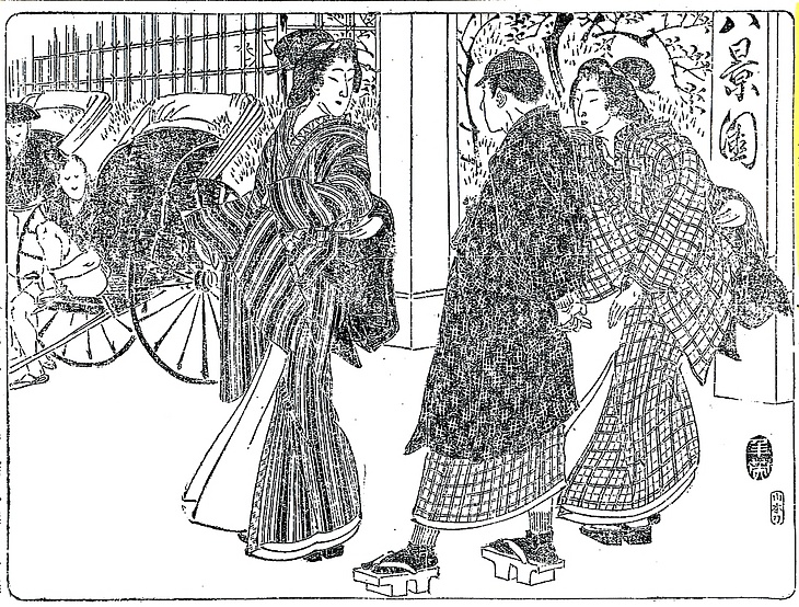 | 説明 | お邸のお嬢様には同じ家に養われて人となった許婚の青年がいる。しかしなぜかその青年は養家もお嬢様も捨てようとしているらしい。お嬢様の味方は小間使の女と田舎出の朴訥な書生。第1回は、許婚の青年が仮の宿にしている大森山王の温泉宿を訪ねる三人。女中と書生を伴に連れた器量よしのお嬢様。「春浅き頃」とあるので三人とも綿入れを重ねている。お嬢様は子持ち縞風のきものと下着の二枚襲、裾袘(フキ)を厚く出し、襟をぐっと抜いて半襟をいっぱいに見せている。髪は高島田で黒塗りの下駄、帯は垂れ結びか。左手の先は袖でくるんで帯の上に抱えている。女性がバッグの類の物を持たなかった時代は、用のない手の扱いに工夫が必要で、その人その人の癖があったようだ。書生は「久留米絣の綿入羽織、脛をあらわす木綿温袍(ヌノコ)、銃猟シャップを横手に被り、肩を怒らす剛勇(ツヨガリ)風」という典型的な当時の書生スタイル。無骨なこういう羽織を書生羽織といったが、のちにはずいぶん意味が変わっている。きものは裾みじかに着て、その下からたぶんネルの股引のすぼまった部分が見える。メリヤスのシャツと股引が袖にも足首にも見えているのもこの手合いの特色。紺足袋にまな板のような薩摩下駄を履いている。品川の海を望む景勝の地大森山王辺は、池上本門寺にも近く、1876(明治9)年には鉄道の駅も開設した。後の八景園という看板は人出を当てこんで新しくできた遊園地。第3回では許婚の青年を捉えて詰問している。青年は「二重合羽(マント)を身に纏い(……)」とあるが、二重外套という方がふつう。しかし上がケープ型になっているため、こういう言い方もよくされた。(大丸 弘) |