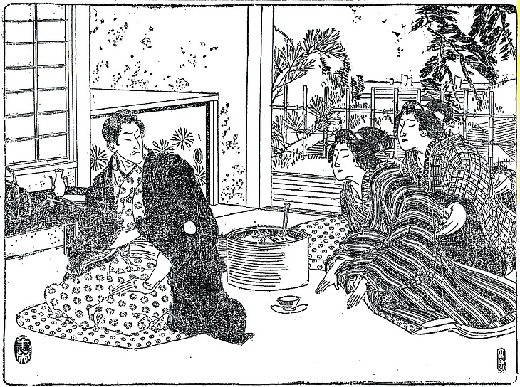 | 説明 | 結婚の約束のすでにできている二人、大森の八景園で男の方は一人、女の方は二人の伴のものを連れての出会い、という場面。男の方はどうやらあまり気に染まぬ縁談なのか、相手に半ば背中を向けて渋い表情。娘は十七,八歳、連れの女中は二十二,三歳でこれは丸髷の既婚者だが、どちらもきものをごくゆるく着ていて、襟も胸元も大きくはだかっている。3月初めのまだけっこう寒い時期で、手あぶりの火鉢も置いてあり、女たちは袘(フキ)の厚い綿入れのきものを着ているが、襟をこれだけ開いていられるのは、この時代の人の訓練のせいか。部屋を開け放して夏座敷のように外の景色を見せているのは、構図上のウソだろう。(大丸 弘) |