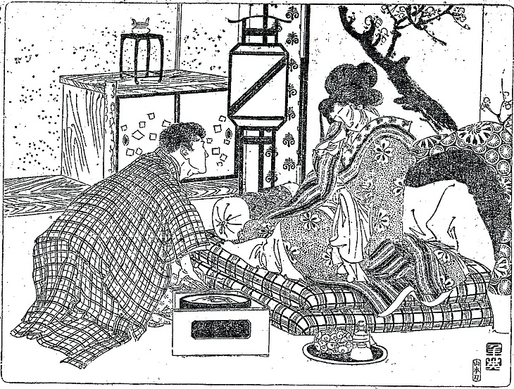 | 説明 | 継子(ママコ)いじめもの。意地の悪い芸者上がりの後添いに泣かされるお嬢様。とはいえ、お嬢様は贅沢このうえない生活の様子。夜具は十数センチありそうな厚い敷布団を重ね、掛けも山のような夜着。その敷布団にシーツは用いず、太鼓のような枕のカバーも派手な柄物。寝間着はたぶん赤っぽい友禅模様の長襦袢、その下に縞物のきものとこれも柄物の襦袢を重ねていて、しごきを前で結んでいる。部屋の暖房が火鉢ひとつで寒いのかもしれないが、ずいぶん窮屈な寝装束。布団の向こうに大きな角行灯が置いてあるが、まだ石油は使っていないようだ。こうした寝間の照明には石油のにおいが嫌われ、ずっと後まで種油の灯心の有明行灯を愛用する人があった。(大丸 弘) |