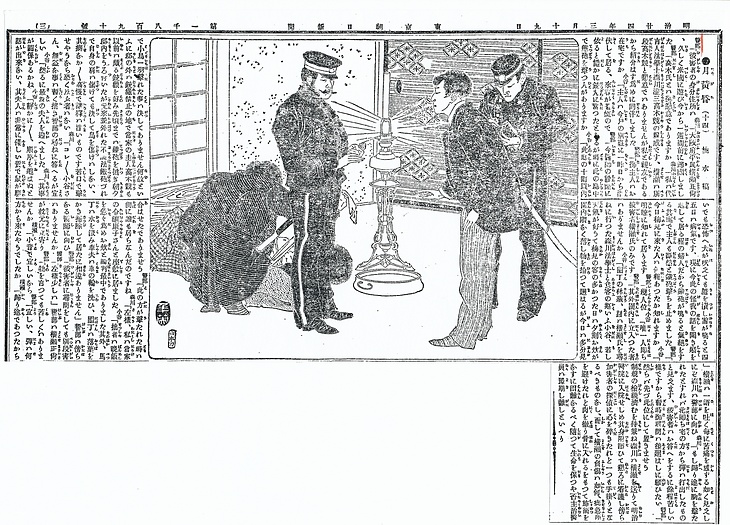 | 説明 | 第14回は背後から胸部を銃撃された傷害事件の現場検証。被害者はこの邸の梅見の客。警官の質問に対応しているのは、被害者を伴ってこの邸を訪れた、物語の主人公の一人で代言人、つまり弁護士。三人の警官のうち、真んなかの尋問中の警官は服装からみて警部補で、右端は巡査。警官の制服は1896(明治29)年に改正され(→年表〈事件〉1896年11月 「巡査服制の改正」東京日日新聞 1896年11月27日4面)、ダブルボタンのこのスタイルは、ほぼ明治20年代までのもの、と知っておけばよい。なお、警部補の足もとを見ると靴の踵状に描かれている。一人だけ土足のまま上がるというようなことがありえたのか。第19回は同じ四人が、被害者を病院に送り込んだあとその門前でたたずむ姿。警官のサーベルが目立つが、警官の武器が、実際に警棒から洋刀に変わったのがこの数年前(1883(明治16)年)のことで、当時の人々にとっても論議の的になっていた。(大丸 弘) |