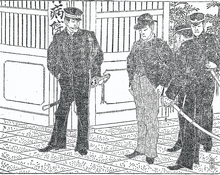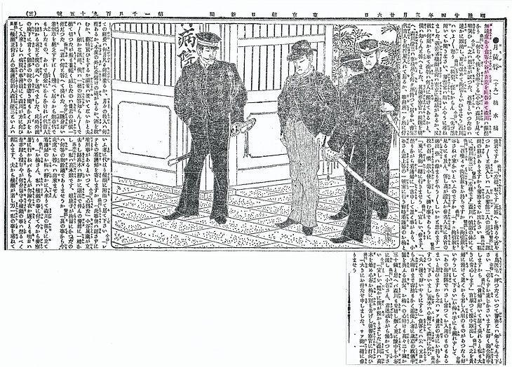 | 説明 | 第14回は背後から胸部を銃撃された傷害事件の現場検証。被害者はこの邸の梅見の客。警官の質問に対応しているのは、被害者を伴ってこの邸を訪れた物語の主人公の一人で代言人、つまり弁護士。三人の警官のうち、左側の尋問中の警官は服装からみて警部補で、右端は巡査。警官の制服は1896(明治29)年に改正され(→年表〈事件〉1896年11月 「巡査服制の改正」東京日日新聞 1896年11月27日4面)、ダブルボタンのこのスタイルは、ほぼ明治20年代のもの、と知っておけばよい。なお、警部補の足もとを見ると靴の踵状に描かれている。一人だけ土足のまま上がるというようなことがありえたのか。第19回は同じ四人が、被害者を病院に送り込んだあとその門前でたたずむ姿。警官のサーベルが目立つが、警官の武器が警棒から洋刀に変わったのがこの数年前(1883(明治16)年)のことで、当時の人々にとっても論議の的になっていた。(大丸 弘) |