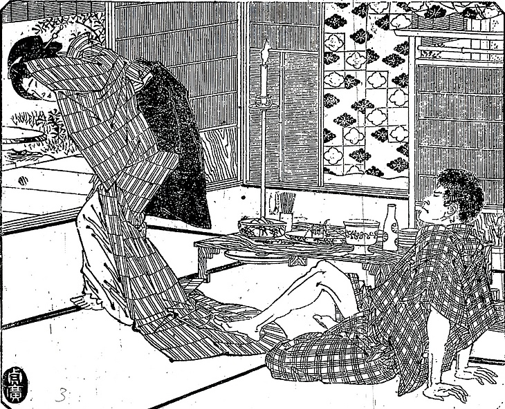| 説明 | 柳橋の料亭の小座敷。客のならず者から難題をふっかけられて逃げ出そうとする芸者。あとの時代になると、おなじみの相手でもないかぎり、芸者が縞物などを着てお座敷に出ることはないが、この時代は素人の女性の日常着と芸者の衣裳との間に、それほどの隔たりがなかった。家の中での曳き裾もまだスッカリ廃れてはおらず、芸者らしさといえば潰しにした髪型と、結び下げにした帯くらいか。東京周辺では結び下げを柳と呼ぶようになる。本文中に夕暮れとあるが、すでに石油ランプの普及しているはずのこの時代、まさか卓上の燭台だけが部屋の中の照明具ではないだろう。あるいは舞台の「面明り(ツラアカリ)」のような目的のために置いたのだろうか。(大丸 弘) |
