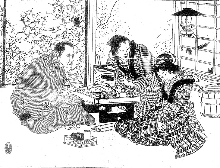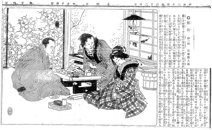 説明 神田の西洋洗濯屋の家族。晩酌の膳に向かっている父親と母が、十六になる娘に向かって、ある華族のもとへの妾奉公を強要している。このすぐあとに、父親による「手弱きお鳥の衿紙を取って引据え拳を固めて続け打ちに打擲(チョウチャク)なすにぞ」と、娘の悲鳴に近所の人が驚いて駆けつけるような場面になる。この時代はどこの家でも食事は一人膳で、父親の晩酌の済むまで、女房や子どもは父親の話し相手をしながら待っていることもあったろう。女房と娘とは襟付きのきものをごくゆるく着ている。娘に向かって父親が、「(お妾になれば)そんな醤油で煮染めた様な単物などを着て居ずとも、それこそお蚕ぐるみの不景気知らず」などと言っているから、挿絵ではわからないが、けっこう傷んだ木綿のきものなのだろう。なお、作者・採菊散人の息子・鏑木清方は、この年、挿絵を描いている水野年方のもとに、十三歳で弟子入りしている。(大丸 弘)