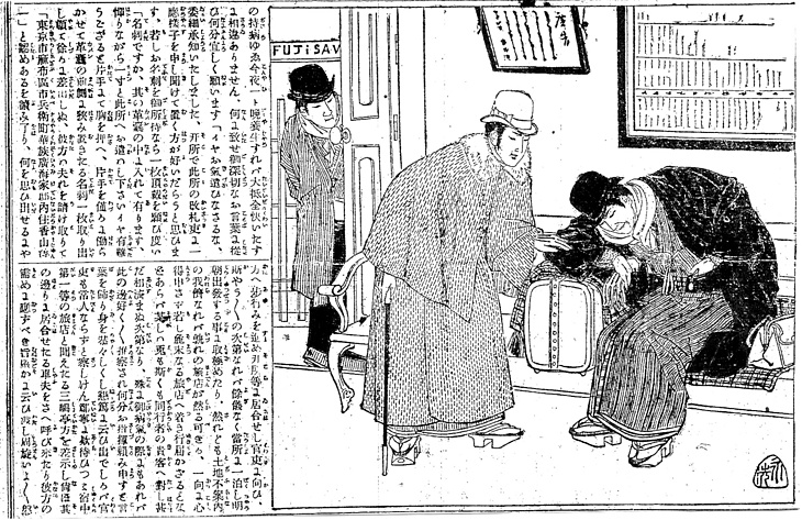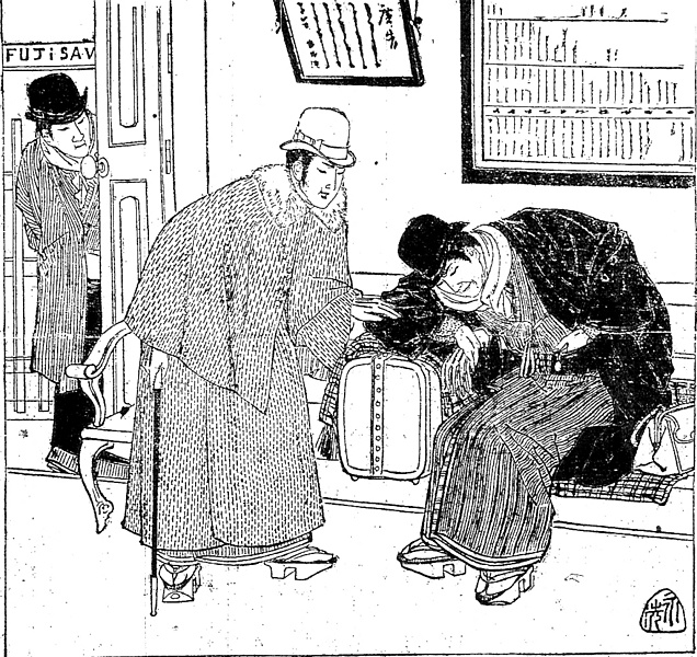 | 説明 | 東海道線の車中で発病した男を、たまたま隣に乗り合わせた男が介抱して、途中三島駅でともに下車した。これから宿泊の手配をと相談しているところ。苦痛に耐えている右側の四十男は、黒紋附の羽織に紬縞のきもの、裾袘(フキ)も厚く二枚を重ねている。大きな革鞄を持ち、山高帽を被り、畳表の付いた堂島の下駄を履いて、首巻を丹念にしているところは、裕福な商人であるらしい。介抱しているのは「スコッチの二重合羽を纏いたる三十二三の男」。富岡永洗の描いた二重合羽、すなわち二重廻しの細かい点々は、柄ではなく、毛織物素材の表現だろう。(大丸 弘) |