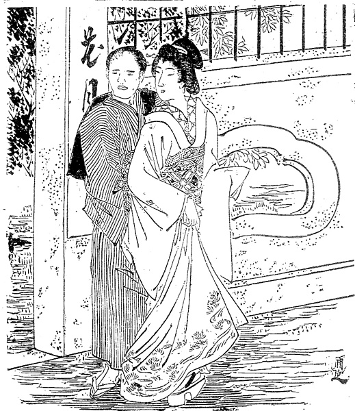 | 説明 | 芸者になった娘がはじめて商売に出る初座敷。このものがたりでは十九の娘が芸者屋の仕込みになって、まだそう日もおかずにお座敷に出るが、めずらしい例かもしれない。料亭のお座敷に呼ばれた芸者は、かならず黒の紋付き裾模様の正装で裾を曳かなければ失礼になる。芸者の場合それを「出の衣裳」とよぶ。この時代はまだ中以上の家庭では、正月などには女性はこうした襲衣裳をしていた。ただし家庭の女性はこの恰好で外出することはないが、芸者はそうはいかないので、裾を摘んで引き上げる動作が芸者らしいすがたとなった。ふつう芸者は右手で三味線を抱えるので、褄は左手で持たねばならない。それで芸者の左褄といわれたが、なにも左手でなければならないわけではなく、この挿絵のように三味線持ちの箱屋がついていれば、右手で引き上げて悪いことはない。(大丸 弘) |