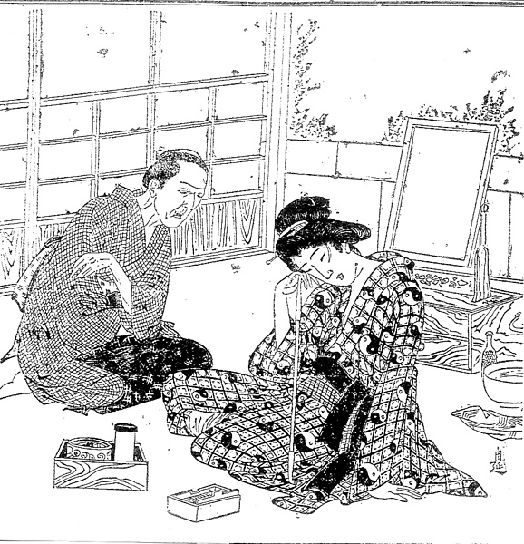 | 説明 | 芸者に出た娘が売れっ子になったのを、だれよりも喜んだのはその母親だったろう。娘を売ったときにすでにまとまった金を懐にしたのだが、その後もなにかというと小遣いをせびりに来る。芸者は置屋に抱えられていても、外出は勝手だし、ときには遊びにくるなじみの客もあるから、娼妓のように長襦袢でいるようなことはない。派手な柄のきものに細帯をぞんざいに締めて、すでに吸い覚えたらしい長煙管を、下げた額につっかえ棒にしているこのなりたての芸者は、「おっかさん、わたしは抱えの身ですから、お座敷で貰うものはみんな家(芸者置屋)へだしっちまうのです」と、苦しい言い逃れをしている。その髪は芸者島田、母親はまだ四十代のはずにしては老け過ぎている。髪はわからないが、小さな丸髷か、手づくねのいぼじり巻(疣毟巻)だろう。(大丸 弘) |