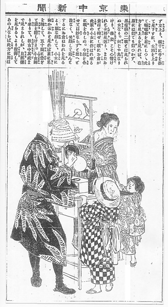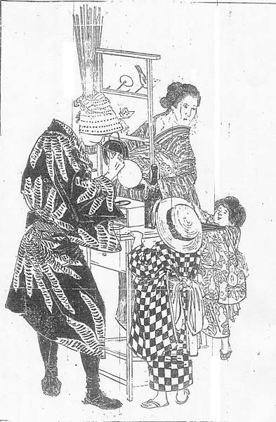 | 説明 | 八年後に菊池幽芳が[大阪毎日新聞]に連載した「己が罪」とはべつの作品。この日の切迫した物語とは無関係な挿絵。挿絵はこの時代どこにも見られたしん粉細工の飴屋。しん粉細工は米の粉を蒸して白い飴状にし、お客の注文によってそれを捏ねて、小さな動物などをつくった。動物の胴体などは、細い竹筒を刺して、息で吹いて膨らます。いまやっているのがそれ。この種の子ども相手の物売りは、江戸・明治時代は客寄せのためずいぶん派手な、変わった恰好をしている者もいた。半七捕物帳の唐人飴売もそのひとつ。この飴屋も足拵えは紺の脚絆・足袋・草鞋掛けだが、頭は手拭いを粋な吉原被り、大形と言いたいような派手な中形の浴衣を着ている。手前の大きな麦藁帽子の子どもは男の子だが、長い袂のきものを着ていて、これはこの時代の東京ではめずらしくはなかった。(大丸 弘) |