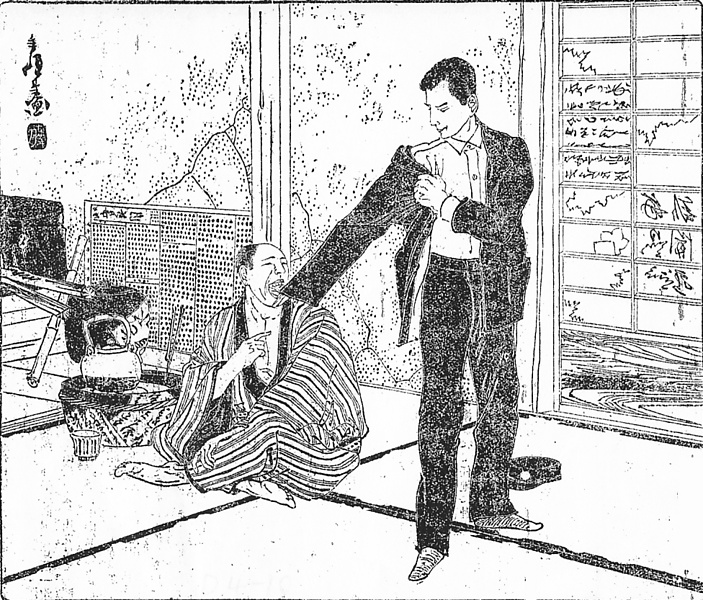 | 説明 | 親分の身代わりになって下谷警察署の拘留所に収監されている子分を、看守に化けて救い出そうという手はず。縄取、あるいは縄夫と言われた、看守の制服を着ようとしている救出役のべつの子分のそばに、どっかと座っている親分は、もう盗賊稼業から足を洗っていて貧乏暮らしのよう。畳の小部屋の隣は三尺の板敷きで、その向こうに竈(カマド)と二,三本の薪。火吹き竹に消し壺がある。親分は黒襟付きでどてら風の太縞の袷一枚を着ており、そのに下はなにも着ていないようにも見えるが、襦袢は着ているだろう。(大丸 弘) |