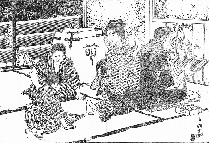 | キーワード | 肩を叩く;肩たたき;腕まくり;裸足;禿げ;書見台;煙草盆;地窓 |