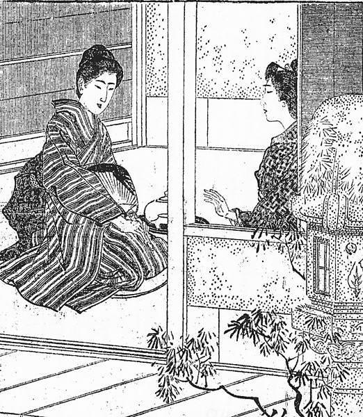 | キーワード | 竪縞のきもの;狐目;つり目;おちょぼ口;うちわ;縁側;灯籠 |