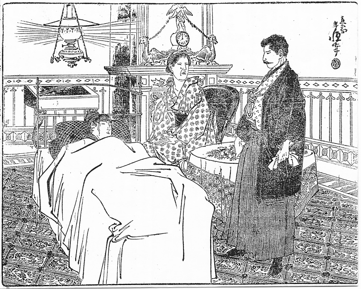 説明 たまたまその庭に招じ入れられた隣家で負傷し、そのまま傷の手当てを受けて一室に閉じ込められた娘。非現実的なストーリー同様、画家の稲野年恒が、西洋の絵を参考にして精一杯の想像で描いた洋風の寝室も不自然さが目立つ。とりわけ鉄製のベッドは、西洋風の寝具を病院でしか見たことのない画家らしい。この洋間はフローリングに大きなカーペットを敷いているのだが、カーペットがあっても洋間ではスリッパを用いる日本の習慣が、まだできていなかった時代のようだ。(大丸 弘)