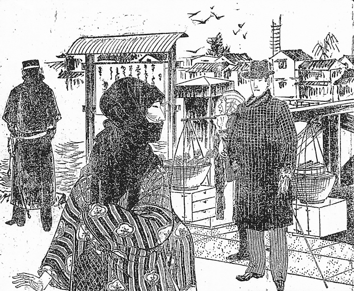 | 説明 | しばしばお高祖(コソ)頭巾は、明治の女の姿への郷愁として語られる。時が移って1930(昭和5)年にもなれば、「この節のお高祖頭巾はめずらしいと思います。東京なぞでは絶無と云ってよいでしょうね。私の故郷でなくても田舎へ行けば、猶その風俗が残っています」といわれた(且原浩爾「お高祖頭巾」【資生堂月報】1930年2月)。お高祖頭巾というより、お高祖頭巾風の防寒かぶりものは、寒い地方へ行けばはやり廃りのない必要品だから、その広がりについては民俗学畑の方々がくわしい。江戸時代から受け継いで、印象的な明治風俗となったお高祖頭巾は、また袖頭巾とも呼ばれた。日清戦争頃の1894(明治27)年10月10日号の【家庭雑誌(民友社)】には単に「女頭巾の仕立方」とだけあって、「追々寒気に向かえば女頭巾入り用の時節に趣きぬ、但し女頭巾は十一月末方よりぼつぼつ着用せらるるが、今より裁縫し置きても必ずしも早計にあらざるべし」とある。ちょうど女のきものの片袖位の大きさ、一尺に四尺くらいの裂(キレ)の二辺を縫合わせて、すっぽりとかぶると、後ろの下の方は少し縫わずにおいてぐるぐると首に巻く。この絵はそれ以前の、半天に頭巾という組み合わせで、女性の防寒用。(大丸 弘) |