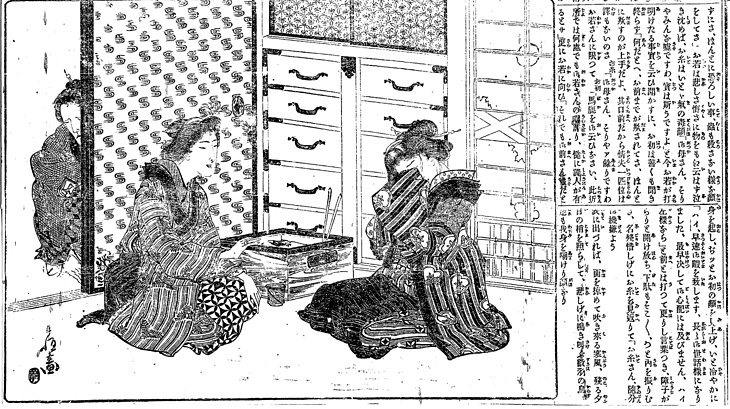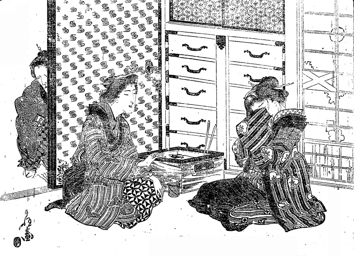 | キーワード | 袖で顔を覆う;前垂れ;前掛け;黒襟;破れ障子;箪笥(たんす);火鉢 |