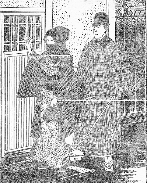 | 説明 | 女はお高祖(コソ)頭巾。お高祖頭巾はこの時代でも古風だが、その古風さを求める人々からは好まれている。外国人にも日本女性の美しい姿と言われた。大きな丸髷の上に被るべきもので、束髪では恰好がつきにくい。この女性が手に持っている手提げ鞄は、俗に女唐と言われた布製の物入れで、ちょうどこの1890年代(ほぼ明治20年代)半ばに現れている。多くは繻珍製でニッケルの口金が付いていたという。女持ちのハンドバッグの最初のもの、と言ってよいだろう。(大丸 弘) |