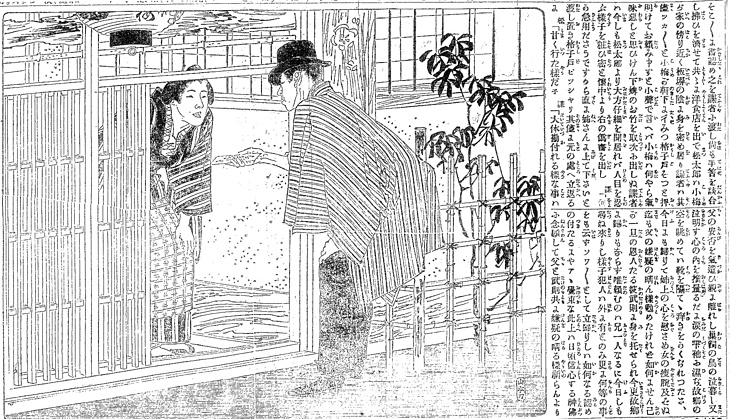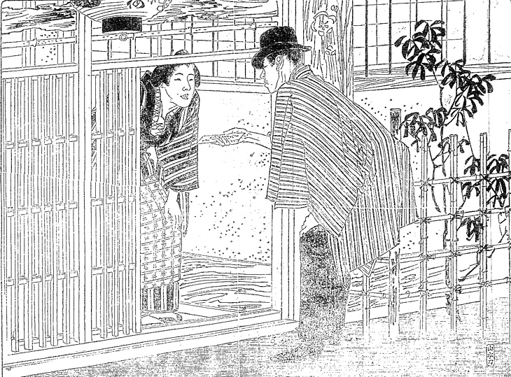 説明 芸者置屋の戸口で、芸者をおびき出すための贋手紙を、応対に出てきた女中に手渡す探偵。本文には諜者(チョウジャ)とあり、ここでは雇われた人間に小遣いをもらっているから、私立探偵に当たるものらしいが、警察の下働きもしたようだ。すでに探偵社という看板を出しているところもあった。帽子に靴、ズボンで上に縞の羽織という奇妙な恰好は、そのままこの男のはっきりしない身分を表しているよう。四つ目垣をめぐらせ、自然木をあしらった門柱など、この芸者のけっこうな暮らしが窺える。芸者屋にかぎったことではないが、格子戸口が低いため、訪れる人も迎える人も、いやでも前屈みになる。(大丸 弘)