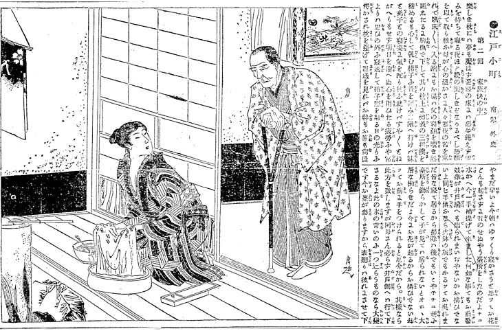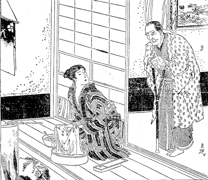 | 説明 | 大勢の家族や弟子を抱えた女役者お満のせわしい朝の場面。老いた母親はじめ、みんなに気を遣いつつ朝餉の支度と、自分の身仕舞いを手早く済ませている。お満は寝間着のままの細帯すがた、裏庭に面した縁先でいま手水(チョウズ)を使っている。縁側の廊下を突き当たっての左側は雪隠の戸があるはず。その戸の先に大きな自然石を彫り窪めた手水鉢が据えられ、上から芸人の家らしい派手な手拭きが下がっているのはお約束。お手水というと便所を意味する場合と、本来の意味に近く手を洗うこと、あるいはその場所を指す場合とがあり、その点はいまのお手洗いと同じ。水場が台所だけだったこの時代、洗面や化粧などは縁端を利用するしかなかった。本文中に、外の井戸から手桶一杯の水を提げてきて、手水鉢の水を替えた――とあるから、台所の水甕(ミズガメ)の外に、洗面等に使う水はこの庭先の手水鉢を利用していたのだろう。便所の手洗いにも使う手水で洗面や口すすぎをするのは、いまの人には考えられないが、神社に詣でるときの、鳥居のかたわらの手洗いも手水と言っているから、この時代の人には抵抗はなかったにちがいない。お満は手水鉢から平べったい金盥(カナダライ)に汲みとった水に、差し湯をして使っている。両側に置かれているのは歯磨きの房楊枝と、楊枝入れと思われる。父親は片方の足が義足。わが国で継ぎ足などと呼んだ義足は、外来技術に独自の工夫を加えて外国人を驚かすような発達を見せ、なかでも富士登山の成功で気を吐いた小柳義足は有名。(大丸 弘) |