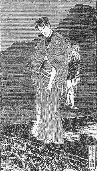 | キーワード | 埠頭;商家の若旦那;黒襟;竪縞のきもの;角帯;白足袋;のめり下駄;丸下駄;袖口に手を差し込む;ケットを着る人 |
