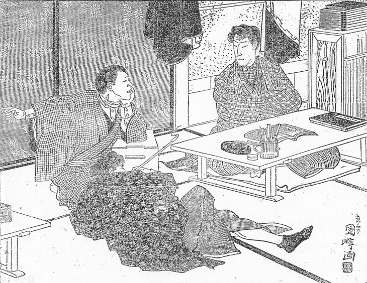 | 説明 | 放蕩のため勘当された神戸は御影の大店の若旦那、一念発起して市内の英語学校に入学し、その学校の塾に寄宿する。挿絵は同じ塾生が彼の部屋に遊びに来て、彼にあることないことを耳打ちし、改心した心に揺さぶりをかけようと試みているところ。書生が細かい縞や紺絣のきものを着ているのは全国どこでも同じ、その下にYシャツのカラーやカフスが見えているのも、明治期を通じてのふつうの重ね方で、Tシャツ式のもっと楽な襟のシャツや、襦袢を着ている例は滅多にない。主人公が座布団の代わりに、人力車夫やお嬢さんのショール代わりにもよく見る、裾に太い横縞のあるケットを敷いていて、この柄の毛布が愛用されていた状況がわかる。英語の学習であるはずなのに、身辺の本がすべて和綴じで、おまけに硯(スズリ)まで置いてあるのは、画家の粗漏か。もっとも1880年代くらいでは、横文字の本でも和紙の和綴じが多かったのは事実。(大丸 弘) |
