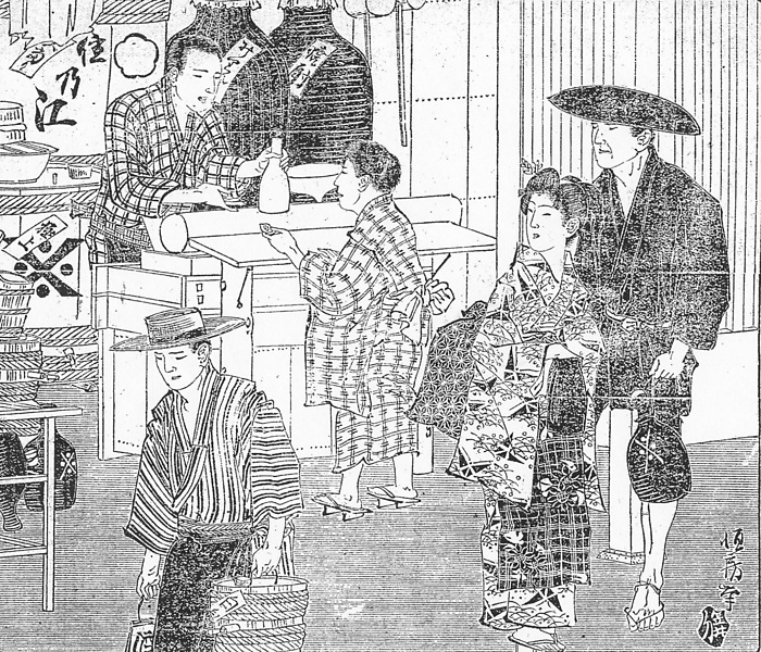 | 説明 | 小売酒屋の店先、客足の途切れることのない繁盛の店という。小売酒屋はふつう立ち飲みの客に升酒の量り売りをするもので、それがいい儲けにもなるのだが、挿絵では店のその部分は隠れている。店の人間は丁稚がひとりだけらしいが、筒袖のお仕着せに前垂れ掛け、酒屋の使用人は扱うものが酒樽など重量があるので、丈夫な厚司織の前垂れ。四人の客はとりどりで、紺の半天に三尺帯、半股引に饅頭笠、草鞋履きの男は人力車夫か。銭を差し出している子どもは、肩揚げのある袂のきものに兵児帯を大きく結んで、家のお使いで父親の晩酌料を買いに来たのだろう。麦藁帽の若者は前垂れ掛けの御店者(オタナモノ)、肩揚げのように見えるが袖をたくし上げているのだ。帯を大きく下げ結びに結んでいるらしい娘は、買い物の袋を提げた手を片方の袖で隠している。店の奥に焼酎、味醂と書かれた大きな壺が並んでいて、そのほか塩や醤油、味噌、また味噌漬や奈良漬を売っている酒屋も多かった。(大丸 弘) |