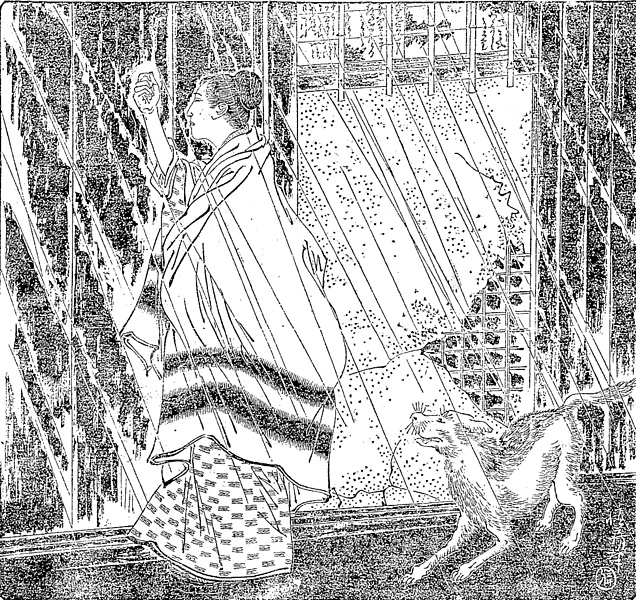 | 説明 | 家出した令嬢を尋ねて、令嬢の家庭教師が烈しい雨降りの深夜、千日前裏、首長屋という怪しげは界隈を尋ね歩く。令嬢の居場所を知ったのが偶然のことだったため、雨の用意がなく、ここまで乗ってきて待たせてある人力車の、膝掛のケット――古毛布で、ショール風に身体を包んでいる。客待ちの人力車の膝掛ケットに清潔そうなものは少なく、客を待っている間は車夫がそれにくるまっていたりするので、神経質な女客には使うのを嫌う人もあった。女教師の着ているのは御召のような雨に弱い絹もの、傘も持たずに雨の中をさ迷うのはよほど緊急の場合とみえる。(大丸 弘) |