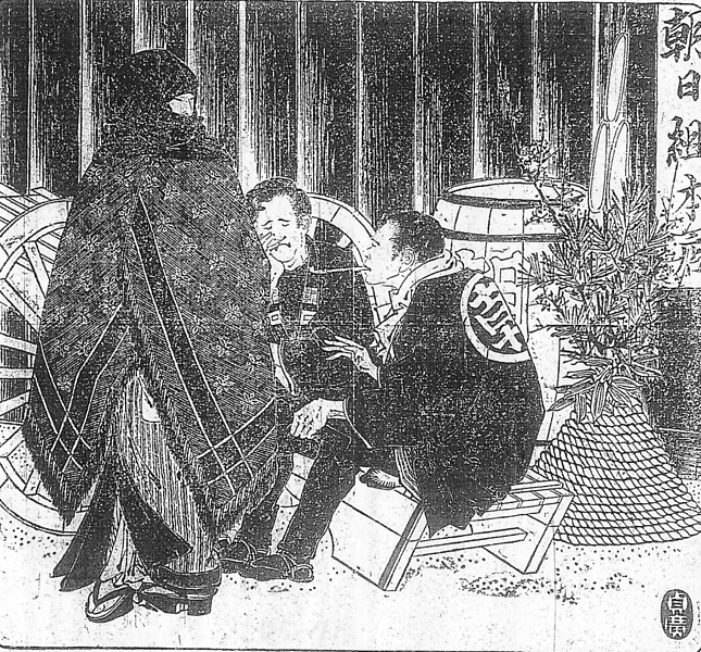 | 説明 | 大八車の荷台に座ってしゃべっているのは、朝日組という運送業者に雇われている人足。雇い先からもらう仕着せの半纏は、背中に「朝」と染め抜いてあって、一目で雇い主がわかるので、話の中にあるようにこの仕着せを看板と呼んでいる。人足や雑用仕事はひとつの雇い主への常雇いではなく、出入りのお店(タナ)が何軒もあるから、半纏を何枚も重ねて着ることもあり、それが見栄でもあったらしい。前に立って二人の話を小耳に挟んでいる女性は、縞のきものの二枚襲、開いた裾から白い蹴出しが覗く。履いているのは黒塗りで畳表月の小町型。お高祖(コソ)頭巾で顔を包み、大きなショールでほとんど全身を覆っている。ショール、ことにこんな大きなものが好まれたのは明治十年代だったから、やや古風、もしくは流行遅れとも言える。(大丸 弘) |