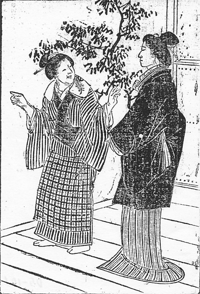 | 説明 | 山の手の奥様とその家の下女。より詳しくいえば、番町辺の下級官員の家の玄関で、隠しきれない仇な姿は芸者上がりとしか見えないという、二十五,六の奥様と、いかにもお喋りらしいがさつ者の、中年の下女が立ち話。奥様が羽織を着ているのはべつにお出かけ、という意味ではない。羽織はむしろ、小寒いときなどに羽織る、家着だった。この時代はまだ、山手でも下町でも、格式を重んじたり古風が好きな家では、女はふだんでも裾を曳いていた。奥様の丸髷は二十代の妻としてはそこそこの大きさ。うれしそうに旦那の浮気の告げ口をしている下女は、まだ眉を剃っている。眉剃りお歯黒は、古い習慣が一般にそうであるように、古風を重んじる人々、というより、無教育の階層にいつまでも残った。(大丸 弘) |
