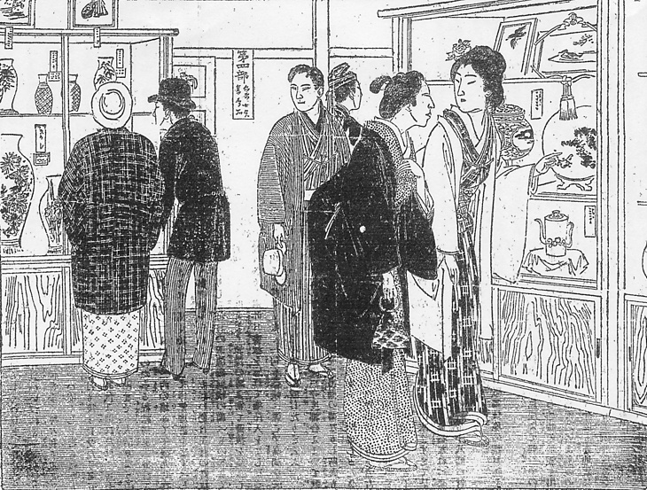 | 説明 | 徳川家所蔵の美術工芸品の展覧会。この時代、この種の展覧会、博覧会には階級を問わず、ずいぶん大勢の観覧者――見物人が集まったようだ。母娘二人連れのうち、母親は老人の茶筅(チャセン)髪にしているが、娘の年からいえばせいぜい五十歳前後にちがいない。娘の方は上げ巻風の束髪。この時代の束髪は前髪は鬢(ビン=横髪)を張らず、前から見ると前挿しの花簪(カンザシ)だけが目立つ飾りだった。(大丸 弘) |
