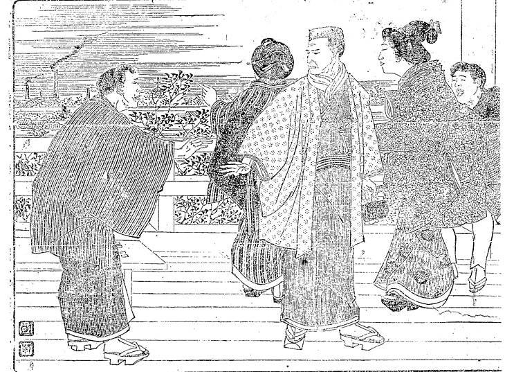 | 説明 | 大阪・船場辺りの裕福な質屋の隠居が、養い娘、それに女中と小僧の供を連れて、生玉社に詣でている。この時代は、防寒のためのコートはまだなかったから、降りさえしなければ、寒中でも綿入れのきものに綿入れ羽織を重ねるだけで、そのため、厚い綿の入ったきものの裾はいかにも重そうに、履物を履いた足の甲に掛かっている。お供の使用人たちは羽織を着ることはできなかった。娘は嫁入り間近で、思いきって高く結い上げた島田の、派手な根掛けが目立つ。隠居は宗匠頭巾を被って首巻をし、腰下げの煙草入れを手に持っているのは、いままで一服していたのだろう。下駄はのめりのある堂島形だが、黒塗りの女物は小町と呼んだ。股引穿きの小僧だけは草履。(大丸 弘) |