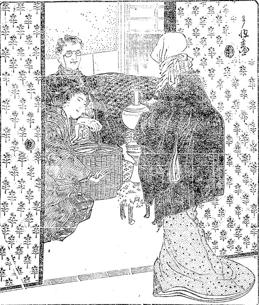 | 説明 | 話は錯雑しているが、急病人の寝間で火箸をつかんでいるのは駆けつけた医師、いまその部屋に入ろうとしているのは伯爵夫人。夫人は「お高祖(コソ)頭巾にすっぽりと顔を包み(……)利休鼠小紋の三枚重に黒縮緬の羽織を纏いし粋に出来て高尚なる服装(イデタチ)」とある。三枚重ねは曳いている裾を見てもいかにも重そうだが、この時代まだ、少し改まった外出には着て出る人があったようだ。医師の掛けている鼻眼鏡であるとか片掛眼鏡は、日本人の顔面の凹凸では無理なため、模倣に熱心だった明治期以後は廃ったが、東京市長だった後藤新平の鼻眼鏡は有名。(大丸 弘) |
