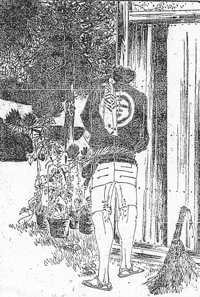 説明 大阪のしがない植木屋の若い者。夜の縁日の出店を終えて家に帰り、戸の外から病んで寝たきりの父親に声をかける。家の周りには商売ものの朝顔などの鉢植えが並び、草箒(クサボウキ)が立て掛けてある。植木屋も職人だから腹掛股引半纏着、暑い季節のこと、股引は膝上までの半股引、半天の裾を折り返して、上に締めた三尺帯の下に突っ込んでいる。印半纏の背中のしるしは出入りのお店(タナ)――表通りの大きな商店の屋号などを染め抜いてあるもの。植木屋も大工や左官と同じく、あまり頭にものを被らないようで、むしろけっして放さない手拭いで、器用に頬被りをする。履いているのは草履でなく草鞋(ワラジ)。(大丸 弘)