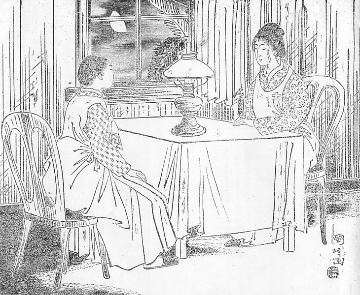 | 説明 | ここは広島の陸軍病院、看護婦休憩室で机を挟んで向き合っているのは、いずれも篤志看護婦の女性で、日清戦争(1894年,1895年)の開戦まもない時期に夫を戦場で失った未亡人どうし。篤志看護婦は無資格の女性が、戦地から後送された戦傷病兵の看護の補助に当たったもの。上流社会の女性が多く加わり、看護婦のイメージを上げることにも役立った。白い看護服の胸に赤十字篤志看護婦会の徽章はつけているが、十年ほど前に制定された赤十字看護婦の制服ではない。着物の襟元はふつうの和服で、袖だけが元禄袖よりももっと細い筒袖になっているのは異様に感じられる。ふたりの束髪は右の女性が上げ巻、左の女性が下げ巻などと、「婦人束髪会」時代の名称などに結びつける必要はない。手軽に自分の手で処理しやすいことが束髪の本来の目的なのだから、スタイルや名称の詮議は無駄だろう。(大丸 弘) |