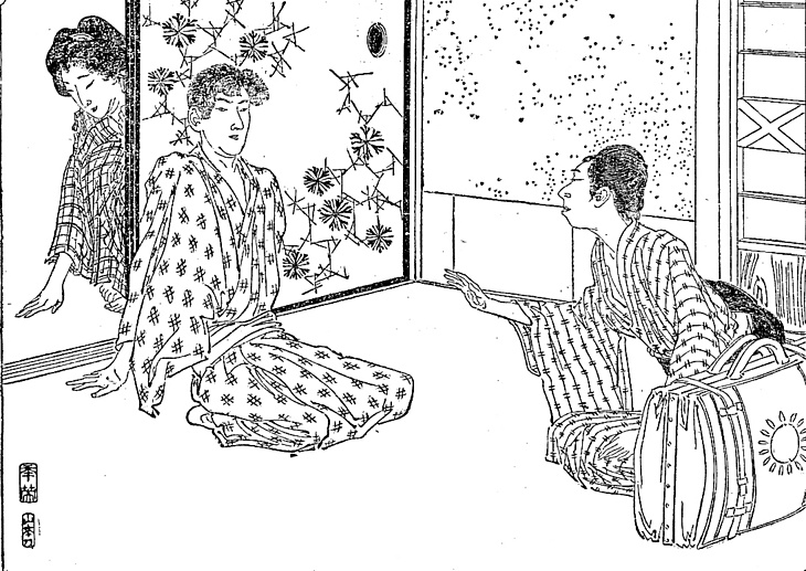 | 説明 | 文筆で身を立てかけている若者。東京で心優しい女性と同棲している。そこへ、故郷から男を勝手に慕う女が家出して押しかけてきた、という図。憎まれ役の押しかけ娘の方は束髪。襖の陰で様子を窺っている女の方の髪型ははっきりしないが、唐人髷のようにも見える。唐人髷はこの時代、二十歳前後の娘のいちばんふつうの髪型だった。押しかけた娘の束髪はまだ前髪がなく、縦にだけ盛り上げる、1890年代(ほぼ明治20年代)のスタイル。かたわらに置いている大きな鞄は、束髪とともに、この娘なり娘の家なりの、けっこう開化かぶれであることを示唆している。もともと日本人は持ち物は肩に担ぐのがふつうで、手に提げるための道具はほとんど持たなかった。鞄の類を利用しはじめても最初は布製の胴乱、と呼ぶものがふつうだった。ここに描かれているのが布製の胴乱か革製かはっきりしないが、持ち手や口金や回してあるベルトなど、舶来の鞄式の構造であることは確か。(大丸 弘) |