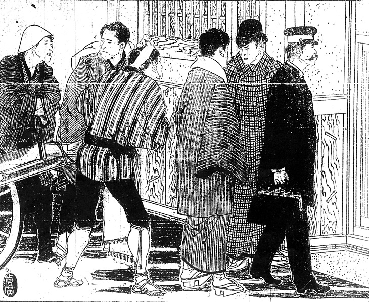 | 説明 | 破産宣告を受けた家を訪れる執達吏の一行。大きな負債の連帯保証人として判をついたために、家財を差し押さえられることになった。この場面はいま玄関から立ち入ろうとする執達吏と、家具類を運び出すための人夫たち。先頭は裁判所から派遣された執達吏で、四年前の1890(明治23)年に、判事、検事などと一緒に制服が決められている(→年表〈事件〉1890年10月 「判事、検事、裁判所書記、執達吏の制服制定」勅令 第260号 1890年10月23日)。判事、検事が聖徳太子風の装いでやや異様と見られたのに対して、執達吏だけは巡査に似たふつうの洋服だったが、それでも職掌柄ずいぶん恐ろしく見られただろう。続く角袖のモジリ外套に中山高帽、無帽で縞の羽織に首巻きの二人は代言人、つまり弁護士と思われる。二人とも白足袋に白鼻緒の堂島(下駄)を履いた裕福そうな身なり。車を曳いている半纏股引の三人は、家財を運び出すために雇われた人夫。こういう短着(ミジカギ)の人々と前の二人の長着とを見くらべれば、自ずから住んでいる世界のちがいがわかる。執達吏が最初に訪れるときは、めぼしい家財のすべてに封印をして、以後勝手に処分することはもちろん、自由に使うことも禁じられたが、日常の衣食に最低必要と判断されるものは除外された。その最低必要な品物を士族と平民とで多少違えている(→年表〈事件〉1872年6月 「華士族平民身代限りの場合、差し押さえを免れる物品の規定」太政官布告 第187号 1872年6月23日)。(大丸 弘) |