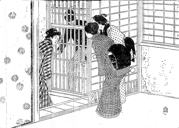 | 説明 | しもた屋の玄関口で、いまこの家を辞そうとしている娘と、別れの挨拶を交わしている二人の女性。送られている娘の髪は島田。送っているこの家の娘は束髪で、ネットを掛け、前挿しの簪(カンザシ)を挿す。束髪の髷が後ろでまとめられる場合には、網掛けと呼んでネットを使うことがあった。しかし、ネットは日本人の目には違和感がありすぎたか、それほど長く続かなかったらしい。母親の頭はこれでも丸髷の一種で、髪が乏しいために髷も前髪も極端に小さくしたもの。外から、帽子を被った紳士風の男が格子に手を掛けているが、江戸時代、用心のために、しもた屋の格子戸は表店の大戸のくぐりと同じく、身体を屈めなければ入れない高さ、四尺(120センチ)そこそこにしてあった。前屈みの姿勢に慣れたその時代の人には、そう苦にはならなかったのだろう。(大丸 弘) |
