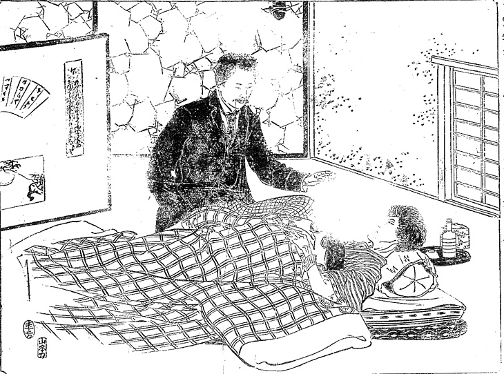 | キーワード | 書生;フロックコート;格子縞のズボン;お見舞い;掻い巻き(かいまき);枕;布団;シーツ |