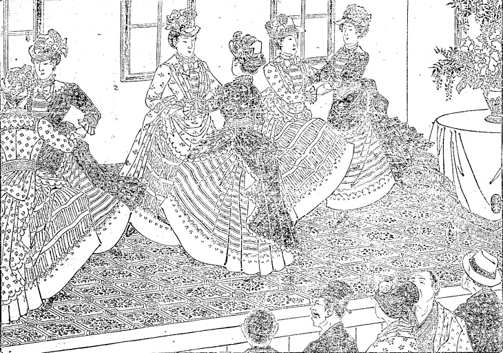 | 説明 | これは社交ダンスではなくてステージダンスであるらしい。ステージ上の女性たちはとくにダンスコスチュームというのでなしに、この時代の欧米人のふつうの street wear を着ている。しかし揃いの模様なので、一応は舞台用なのだろう。本文によれば、これは温習会(オオザライ)ということになっている。しかし、博覧会の人形でも眺めているような見物人の態度を見ると、温習会ということに疑問が生じる。作者の理解、絵師の知識、そしてなんでもありだった時代――、何を信じてよいのかわからない。(大丸 弘) |