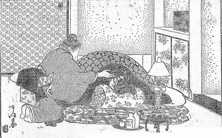 | 説明 | 悪者に拉致され、川に投げ込まれた娘が、通りがかりの若い医師によって幸い助けられ、医師の家の床の間つきの座敷で、母親ともどもの手厚い介抱をされる。関西では東京とちがって夜具は掻巻ではなく、左右に白布、上部襟元に黒い天鵞絨(ビロード)の襟が掛かっているが、敷布はまだ用いていないらしい。病人が結っていた髪はもちろん壊れてしまったので、髪はゆるく巻き縛り、額におきまりの病鉢巻きをさせている。枕は大きな括り枕で、枕紙を巻いているのか、布製の枕カバーなのかはわからない。かたわらで看護している医師の母親は、髪はごく小さな丸髷を結っている。細かい縞のきものに引っ掛け帯、格子縞のある紺の前垂れに白足袋。これが中以上の家庭の、一般的なふだんの恰好だろう。(大丸 弘) |