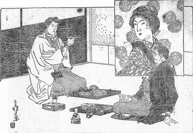 キーワード 竪縞のきもの;メリヤス編みのセーター風の袖口;ワイシャツ;ホワイトシャツ;首巻;煙管(きせる);刻み草入れ;八字髭;煙草盆;座布団;襖(ふすま)