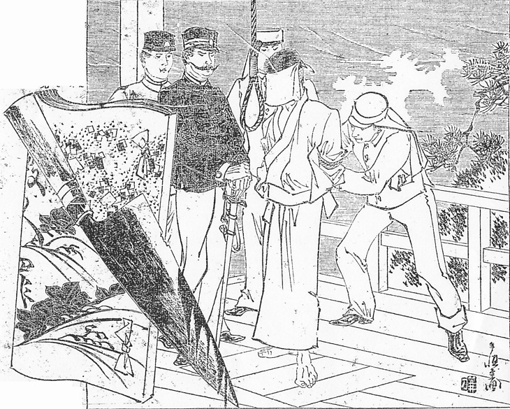| 説明 | ここに描写されている死刑執行の様子は、この時代の事実をほぼ忠実に再現していると見てよい。画面右隅の松の枝を除いて。本文には検事、監獄医、教誨師、などが登場するが、画面に出ているのは被執行人のほかは典獄以下の看守のみ。看守たちの服装は大体において警察官に準じている。1890(明治23)年に警察官の服装が警視総監以下全面改定されて、ここで見るような特色のある、フランス、ドイツの軍帽を真似たデザインになった。トップの広がらないこの帽子は、八年後の1908(明治41)年になくなった。(大丸 弘) |