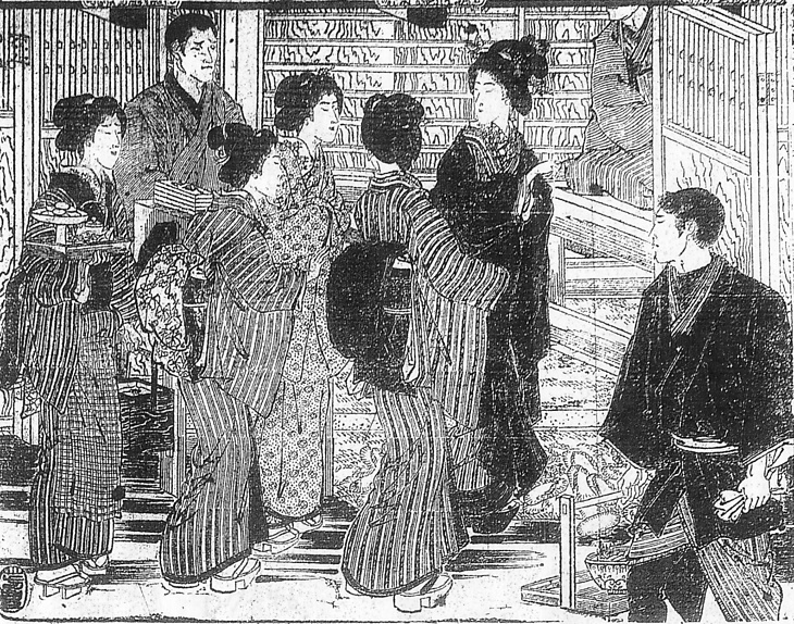 | キーワード | 道頓堀中座;木戸口;お嬢様;黒襟;木履;ぽっくり下駄;のめり下駄;差し歯下駄;半纏;裾まくり |